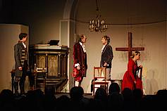 BRIELOW - Goldonis Truffaldino ist quicklebendig. Davon konnten sich am Sonntagnachmittag etwa 80 Zuschauer in der Brielower Dorfkirche überzeugen. Sie erlebten die neue Inszenierung der Schauspieltruppe „Theater in der Kirche“, die den „Diener zweier Herren“ aufgeführt haben. Goldoni (1707–1793) hat mit diesem Stück die Commedia dell'arte reformiert, die feststehende Typen für das Theater vorgab. Statt starrer Charaktermasken bekamen seine Figuren lebendige, menschliche Züge.